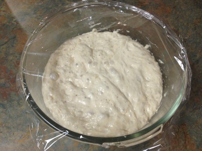 Mix flour, yeast, and salt together in your largest bowl. Pour in your water and mix. I like to use my hands or a butter knife. Yeah, may sound crazy but it works and cleans off easily. You want to mix to make sure the flour is all incorporated or you’ll end up with “flour pearls” and that makes for ugly (and homemade looking) bread. Once you’ve got a nice sticky heap, cover and set aside for at least 2 hours!