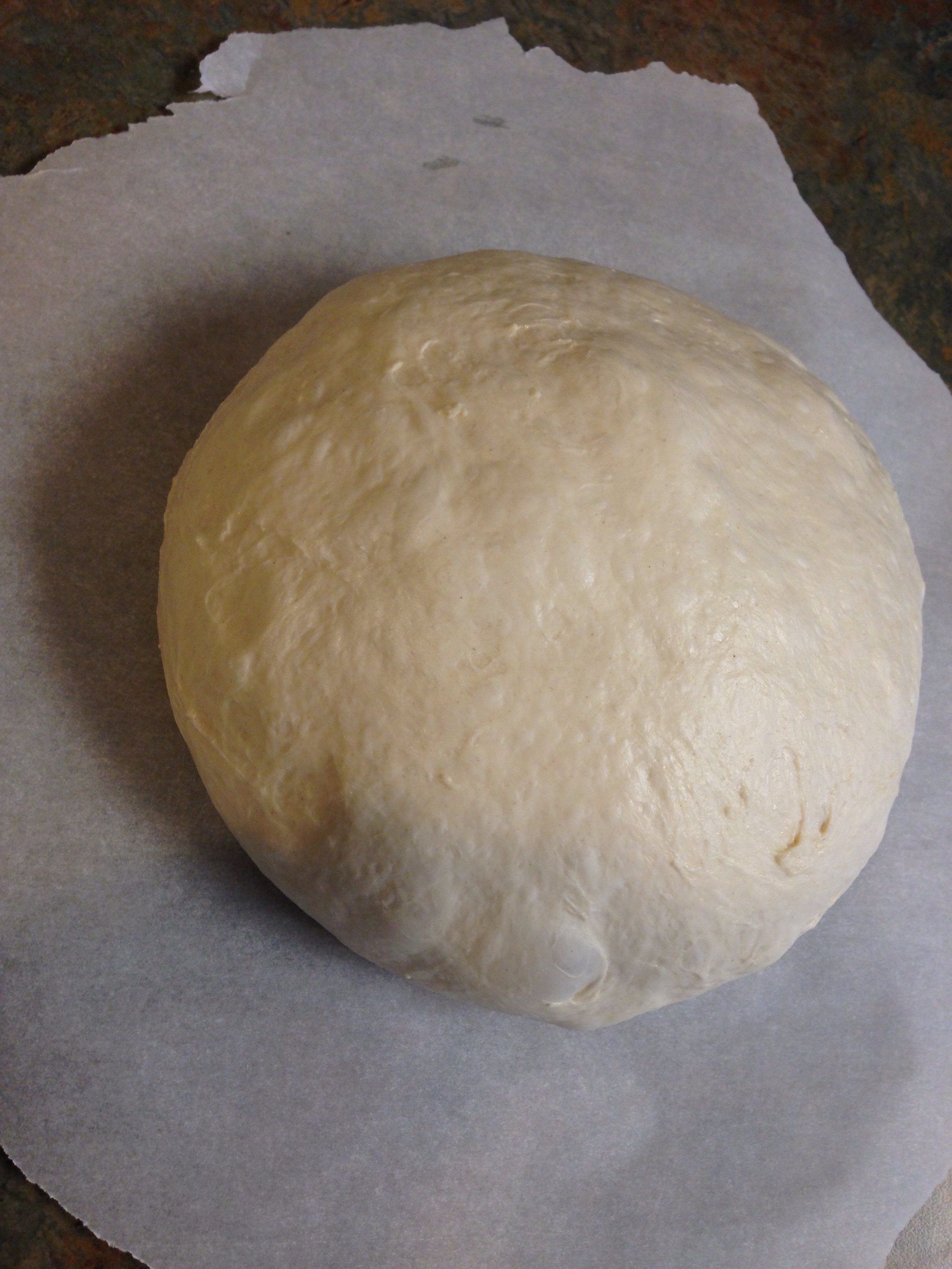 Take it out (do not punch it!!!!!) and shape into a ball. (Shape into a ball – bread term meaning to pull sides down and gather to the bottom of the dough to make into a ball. Go around the dough and get all sides. You want a somewhat taut surface, pull sides and gather at the bottom as needed) Allow the air bubbles to pop out (this will prevent giant holes in your bread). You want to achieve a taught surface without the dough tearing. This surface provides tension for your yeast to rise against and further develop the gluten.